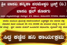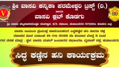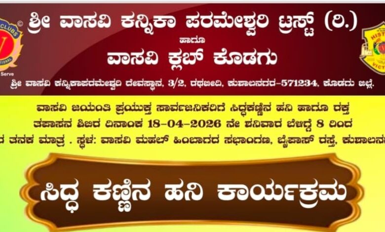 ಕುಶಾಲನಗರ, ಏ 16: ಶ್ರೀ ವಾಸವಿ ಕನ್ನಿಕಾ ಪರಮೇಶ್ವರಿ ಟ್ರಸ್ಡ್ ಹಾಗೂ ವಾಸವಿ ಕ್ಲಬ್ ಆಶ್ರಯದಲ್ಲಿ ಸಿದ್ದ ಕಣ್ಣಿನ ಹನಿ ಕಾರ್ಯಕ್ರಮ ಏ 18 ರಂದು ಕುಶಾಲನಗರದ…