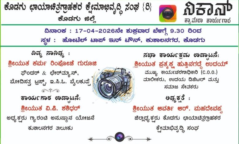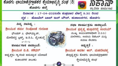 ಏ 17 ರಂದು ಕೊಡಗು ಛಾಯಾಚಿತ್ರಗ್ರಾಹಕರ ಕ್ಷೇಮಾಭಿವೃದ್ಧಿ ಸಂಘದಿಂದ ನಿಕಾನ್ ಕ್ಯಾಮರಾ ಕಾರ್ಯಗಾರ
