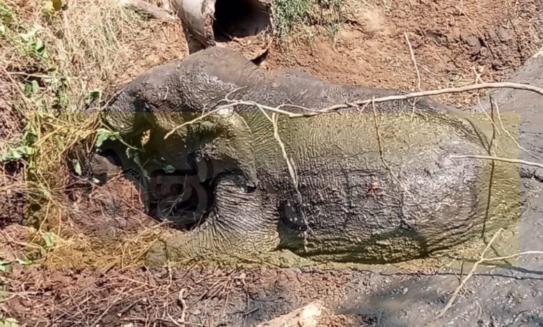 ಕೆಸರುಮಯ ಆನೆಕಂದಕದಲ್ಲಿ ಸಿಲುಕಿದ‌ ಕಾಡಾನೆ.