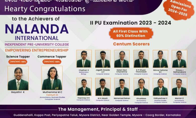 ನಳಂದ ಇಂಟರ್ನ್ಯಾಷನಲ್ ಇಂಡಿಪೆಂಡೆಂಟ್ ಪ್ರಿ ಯೂನಿವರ್ಸಿಟಿ ಕಾಲೇಜು: 2023-24ನೇ ಸಾಲಿನ ದ್ವಿತೀಯ ಪಿಯುಸಿ ಫಲಿತಾಂಶ.