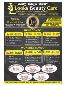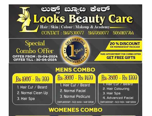 ಲುಕ್ಸ್ ಬ್ಯೂಟಿ ಕೇರ್ ವಾರ್ಷಿಕೋತ್ಸವ ಅಂಗವಾಗಿ ರಿಯಾಯಿತಿ‌ ದರ, ವಿಶೇಷ ಆಫರ್, ಕೊಡುಗೆ ಲಭ್ಯ