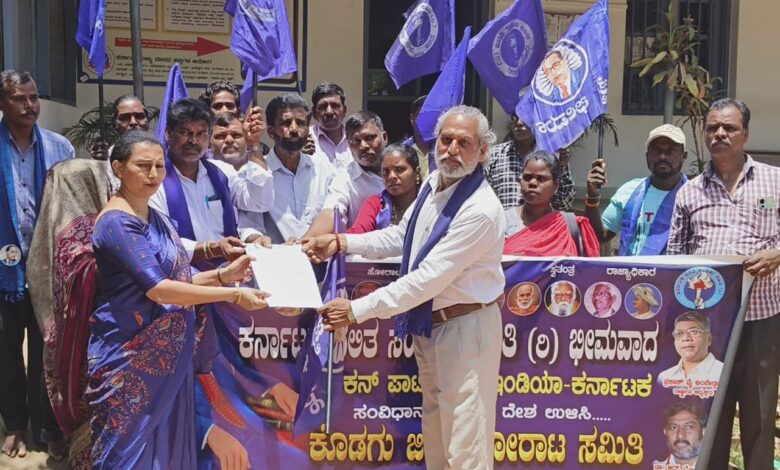 ಕುಶಾಲನಗರ ಏ 16: ಸರಕಾರಿ ಭೂಮಿಗಳನ್ನು ಗುತ್ತಿಗೆ ಆಧಾರದಲ್ಲಿ ನೀಡಬಾರದು ಎಂದು ಒತ್ತಾಯಿಸಿ ಕರ್ನಾಟಕ ದಲಿತ ಸಂಘರ್ಷ ಸಮಿತಿ ಹಾಗೂ ಆರ್.ಪಿ.ಐ ಪಕ್ಷದ ವತಿಯಿಂದ ತಹಸೀಲ್ದಾರ್ ಕಛೇರಿ ಮುಂಭಾಗ ಪ್ರತಿಭಟನೆ ನಡೆಯಿತು.