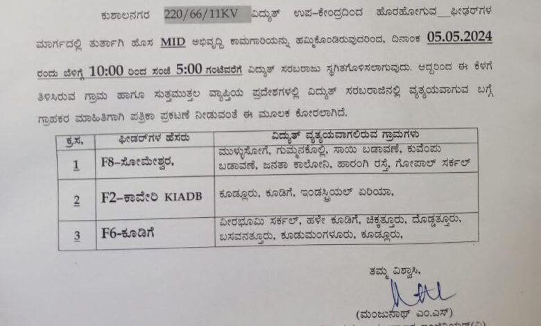 ಆದ್ದರಿಂದ ಎಫ್ 8 ಸೋಮೇಶ್ವರ ಫೀಡರ್ ವ್ಯಾಪ್ತಿಯ ಮುಳ್ಳುಸೋಗೆ, ಗುಮ್ಮನಕೊಲ್ಲಿ, ಸಾಯಿ ಬಡಾವಣೆ, ಕುವೆಂಪು ಬಡಾವಣೆ,ಜನತಾ ಕಾಲೋನಿ,ಹಾರಂಗಿ ರಸ್ತೆ,ಗೋಪಾಲ್ ಸರ್ಕಲ್ ಮತ್ತು ಎಫ್ 2 ಕಾವೇರಿ ಕೆಐಎಡಿಬಿ ವ್ಯಾಪ್ತಿಯ ಕೂಡ್ಲೂರು,ಕೂಡಿಗೆ ,ಕೈಗಾರಿಕಾ ಬಡಾವಣೆ ಹಾಗೂ ಎಫ್ 6 ಕೂಡಿಗೆ ವ್ಯಾಪ್ತಿಯ ವೀರಭೂಮಿ ಸರ್ಕಲ್,ಹಳೇ ಕೂಡಿಗೆ,ಚಿಕ್ಕತ್ತೂರು, ದೊಡ್ಡತ್ತೂರು,ಬಸವನತ್ತೂರು,ಕೂಡುಮಂಗಳೂರು,ಕೂಡ್ಲೂರು ಸುತ್ತಮುತ್ತಲಿನ ವ್ಯಾಪ್ತಿಯಲ್ಲಿ ವಿದ್ಯುತ್ ಸಂಪರ್ಕದಲ್ಲಿ ವ್ಯತ್ಯಯ ಉಂಟಾಗಲಿದೆ.