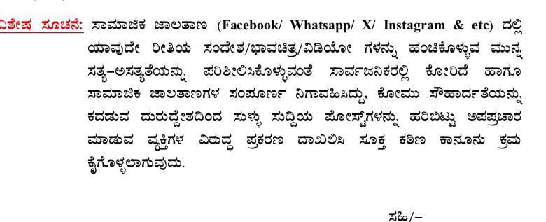 2 (Facebook/ Whatsapp/ X/ Instagram & etc) ಯಾವುದೇ ರೀತಿಯ ಸಂದೇಶ/ಭಾವಚಿತ್ರ/ವಿಡಿಯೋ ಗಳನ್ನು ಹಂಚಿಕೊಳ್ಳುವ ಮುನ್ನ ಸತ್ಯ-ಅಸತ್ಯತೆಯನ್ನು ಪರಿಶೀಲಿಸಿಕೊಳ್ಳುವಂತೆ ಸಾರ್ವಜನಿಕರಲ್ಲಿ ಕೋರಿದೆ ಹಾಗೂ ಸಾಮಾಜಿಕ ಜಾಲತಾಣಗಳ ಸಂಪೂರ್ಣ ನಿಗಾವಹಿಸಿದ್ದು, ಕೋಮು ಸೌಹಾರ್ದತೆಯನ್ನು ಕದಡುವ ದುರುದ್ದೇಶದಿಂದ ಸುಳ್ಳು ಸುದ್ದಿಯ ಪೋಸ್ಟ್‌ಗಳನ್ನು ಹರಿಬಿಟ್ಟು ಅಪಪ್ರಚಾರ ಮಾಡುವ ವ್ಯಕ್ತಿಗಳ ವಿರುದ್ಧ ಪ್ರಕರಣ ದಾಖಲಿಸಿ ಸೂಕ್ತ ಕಠಿಣ ಕಾನೂನು ಕ್ರಮ ಕೈಗೊಳ್ಳಲಾಗುವುದು.
