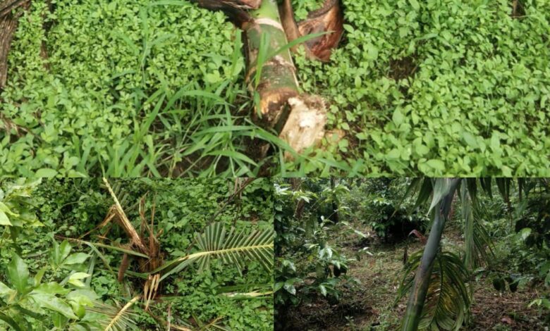 ಈ ಭಾಗದ ಚಂದ್ರಶೇಖರ್, ಅರುಣ್ ಚಂಗಪ್ಪ, ನಂಜೇಗೌಡ, ಸುಜಾತ ಮತ್ತಿತರರ ತೋಟಗಳಿಗೆ ನುಗ್ಗಿ ಕಾಫಿ, ತೆಂಗು, ಅಡಕೆ ಬೆಳೆಗಳನ್ನು ನಾಶಗೊಳಿಸುತ್ತಿದೆ ಎಂದು ರೈತರು ಅಳಲು ತೋಡಿಕೊಂಡಿದ್ದಾರೆ.