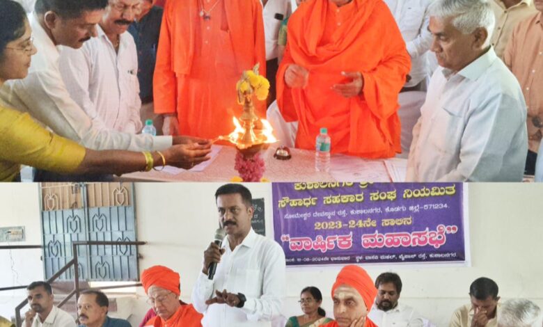 ಕುಶಾಲನಗರ:, ಆ 18:ಕುಶಾಲನಗರದ ಶ್ರೀ ಬಸವೇಶ್ವರ ಸೌಹಾರ್ದ ಸಹಕಾರ ಸಂಘದ 2023-24ನೇ ಸಾಲಿನ ವಾರ್ಷಿಕ ಮಹಾಸಭೆ ಭಾನುವಾರ ಕುಶಾಲನಗರ ಬೈಪಾಸ್ ರಸ್ತೆಯ ವಾಸವಿ ಮಹಲ್ ಸಭಾಂಗಣದಲ್ಲಿ ಹಮ್ಮಿಕೊಳ್ಳಲಾಗಿತ್ತು.