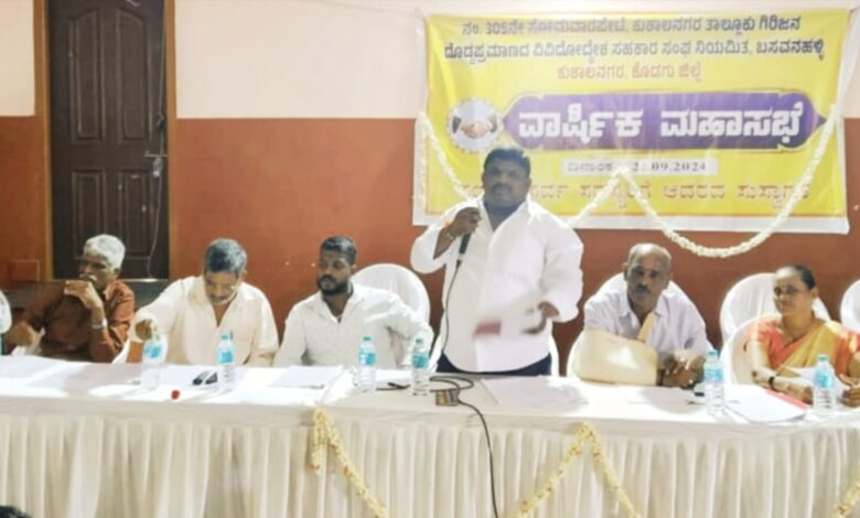 ಕುಶಾಲನಗರ, ಸೆ 23: ಬಸವನಹಳ್ಳಿಯಲ್ಲಿರುವ ಕುಶಾಲನಗರ ಹಾಗೂ ಸೋಮವಾರಪೇಟೆ ತಾಲ್ಲೂಕು ಗಿರಿಜನ ದೊಡ್ಡಪ್ರಮಾಣದ ವಿವಿಧೋದ್ದೇಶ ಸಹಕಾರ ಸಂಘದ ವಾರ್ಷಿಕ ಮಹಾಸಭೆ ಸಂಘದ ಅಧ್ಯಕ್ಷ ಎಸ್.ಆರ್.ಅರುಣರಾವ್ ಅಧ್ಯಕ್ಷತೆಯಲ್ಲಿ ಸೋಮವಾರ ಜರುಗಿತು.