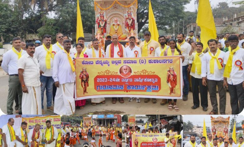 ಅಲಂಕೃತ ತೆರೆದ ಮಂಟಪದಲ್ಲಿ ಬ್ರಹ್ಮಶ್ರೀ ನಾರಾಯಣಗುರು ಮತ್ತು ಕೋಟಿ ಚೆನ್ನಯ್ಯರ ಭಾವಚಿತ್ರವನ್ನು ಪ್ರತಿಷ್ಠಾಪಿಸಿ ಬೈಚನಹಳ್ಳಿ ಮಾರಮ್ಮ ದೇವಾಲಯ ಬಳಿಯಿಂದ ಪ್ರಮುಖ ಬೀದಿಗಳಲ್ಲಿ ಚಂಡೆವಾದ್ಯದೊಂದಿಗೆ ಸಮಾಜ ಬಾಂಧವರು ಮೆರವಣಿಗೆ ನಡೆಸಿದರು.