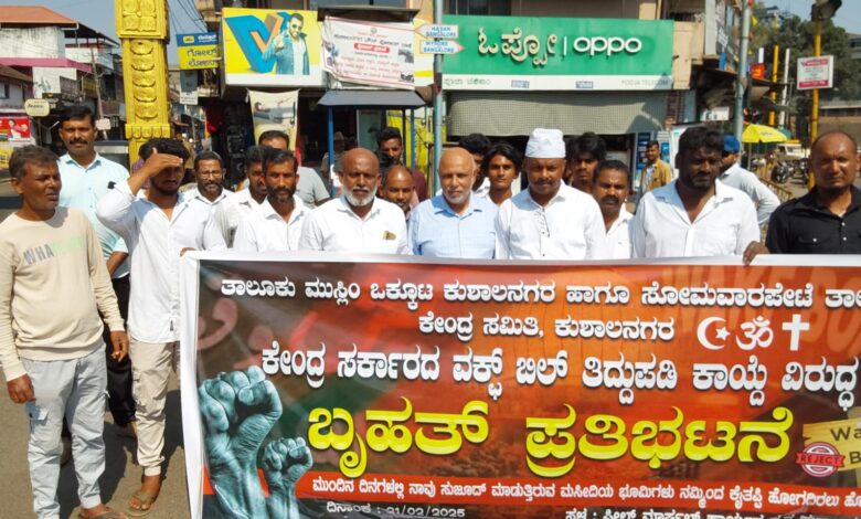 ಕೇಂದ್ರ ಸರ್ಕಾರದ ವಕ್ಫ್ ಬಿಲ್ ತಿದ್ದುಪಡಿ ಕಾಯ್ದೆ ವಿರೋಧಿಸಿ ಕುಶಾಲನಗರ ತಾಲ್ಲೂಕು ಮುಸ್ಲಿಂ ಒಕ್ಕೂಟದಿಂದ ಪ್ರತಿಭಟನೆ