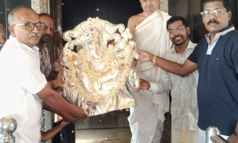 ಕುಶಾಲನಗರ, ಮೇ 14: ಕುಶಾಲನಗರದ ಶ್ರೀ ಮಹಾಗಣಪತಿ ದೇವರಿಗೆ ಶ್ರೀ ಸ್ವಾಮಿಯ ನಾನಾ ರೂಪಗಳಲ್ಲಿ ಒಂದಾದ ಹೇರಂಭ ಗಣಪತಿ ಅವತಾರದ ರಜತ ಕವಚವನ್ನು ಕುಶಾಲನಗರದ ಖ್ಯಾತ ಕಾಫಿ ಉದ್ಯಮಿ ವೆಂಕಟಾಚಲ ಸಾತಪನ್ ರವರು ಬುಧವಾರ ದೇವಾಲಯಕ್ಕೆ ಸಮರ್ಪಣೆ ಮಾಡಿದರು.