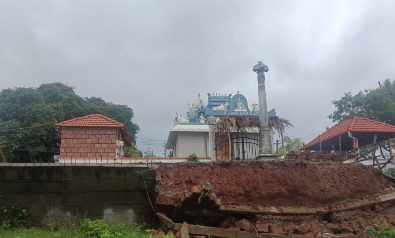 ಮಾದಾಪಟ್ಟಣದ ಶ್ರೀ ಕಾಶಿ ವಿಶ್ವನಾಥ ದೇವಸ್ಥಾನದ ಮುಂಭಾಗದ ತಡೆಗೋಡೆ ಮಳೆಯಿಂದ ಕುಸಿತ