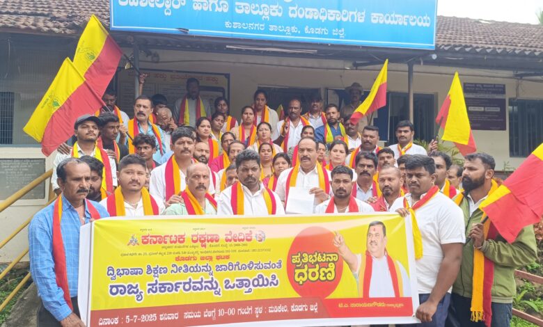 ಕುಶಾಲನಗರ, ಜು 05 : ಕರ್ನಾಟಕದಲ್ಲಿ ದ್ವಿಭಾಷಾ ಶಿಕ್ಷಣ ನೀತಿಯನ್ನು ಜಾರಿಗೆ ತರುವಂತೆ ಒತ್ತಾಯಿಸಿ ಕರ್ನಾಟಕ ರಕ್ಷಣಾ ವೇದಿಕೆ ಕಾರ್ಯಕರ್ತರು ಶನಿವಾರ ಪ್ರತಿಭಟನೆ ನಡೆಸಿದರು.