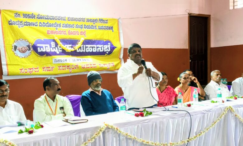 ಕುಶಾಲನಗರ, ಸೆ 18: ಸೋಮವಾರಪೇಟೆ, ಕುಶಾಲನಗರ ತಾಲೂಕಿನ ಗಿರಿಜನ ದೊಡ್ಡಪ್ರಮಾಣದ ವಿವಿದ್ದೋದ್ದೇಶ ಸಹಕಾರ ಸಂಘದ ವಾರ್ಷಿಕ ಮಹಾಸಭೆ ಸಂಘದ ಅಧ್ಯಕ್ಷ ಎಸ್.ಆರ್.ಅರುಣ್ ರಾವ್ ಅಧ್ಯಕ್ಷತೆಯಲ್ಲಿ ಎಪಿಸಿಎಂಎಸ್ ಸಭಾಂಗಣದಲ್ಲಿ ಹಮ್ಮಿಕೊಳ್ಳಲಾಗಿತ್ತು.