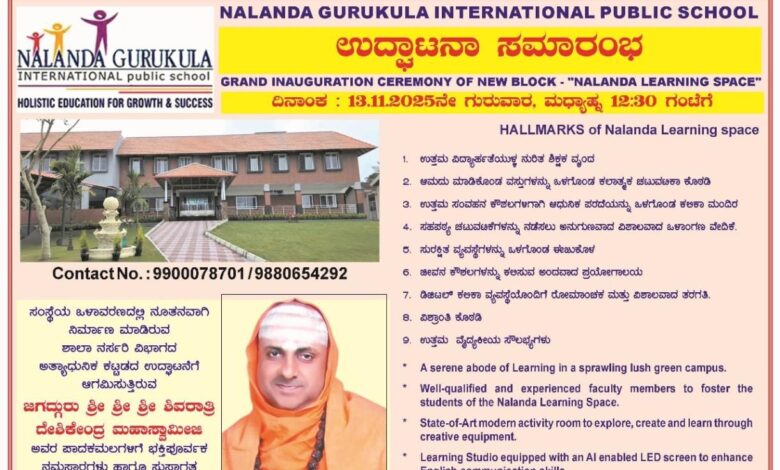 ನ.13 (ಇಂದು) ಗುರುವಾರ ನಳಂದ ಗುರುಕುಲ ಇಂಟರ್ ನ್ಯಾಷನಲ್ ಪಬ್ಲಿಕ್ ಸ್ಕೂಲ್ ನಲ್ಲಿ ಅತ್ಯಾಕಾರ್ಷಕ ಕಟ್ಟಡ ಲೋಕಾರ್ಪಣೆ