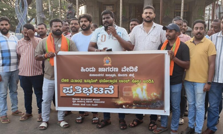 ದೆಹಲಿಯಲ್ಲಿ ನಡೆದ ಬಾಂಬ್ ಸ್ಪೋಟವನ್ನು ಖಂಡಿಸಿ ಕುಶಾಲನಗರ ಹಿಂದೂ ಜಾಗರಣ ವೇದಿಕೆ ವತಿಯಿಂದ ಪ್ರತಿಭಟನೆ ನಡೆಸಲಾಯಿತು.