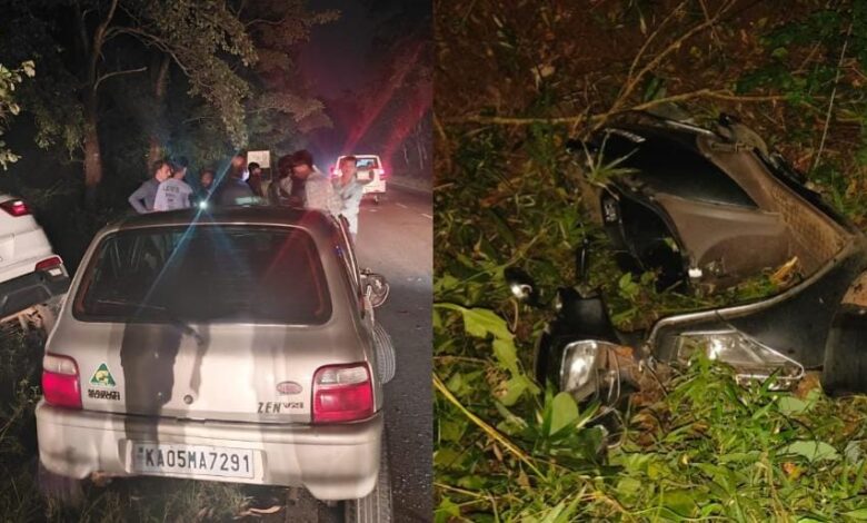 ಡಿಕ್ಕಿಯ ರಭಸಕ್ಕೆ ಬೈಕ್ ರಸ್ತೆಯಿಂದ ಕಾಡಿನೊಳಗೆ ಹಾರಿದೆ.