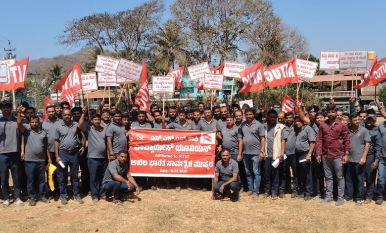 ಕುಶಾಲನಗರ, ಫೆ 12: ಕೇಂದ್ರ ಸರಕಾರದ ಕಾರ್ಮಿಕ ವಿರೋಧಿ ನೀತಿ ಖಂಡಿಸಿ ಕುಶಾಲನಗರದಲ್ಲಿ ಕಾರ್ಮಿಕ ಸಂಘಟನೆಗಳಿಂದ ಪ್ರತಿಭಟನೆ ನಡೆಯಿತು.