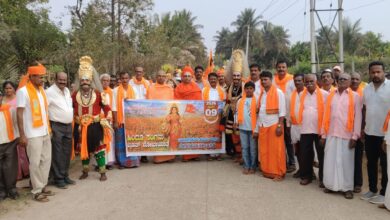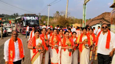 ವಿವಿಧ ವೇಷಧಾರಿ ಮಕ್ಕಳನ್ನು ಹೊತ್ತ ಬೆಳ್ಳಿ ರಥ, ಭಾರತಾಂಭೆ ಭಾವಚಿತ್ರ ಒಳಗೊಂಡ ವಾಹನದೊಂದಿಗೆ ಕಳಸ ಹೊತ್ತ ಮಹಿಳೆಯರೊಂದಿಗೆ 700 ಕ್ಕೂ ಅಧಿಕ ಹಿಂದೂ ಬಾಂಧವರು ಪುರುಷರು ಮಹಿಳೆಯರಾದಿಯಾಗಿ ಕೇಸರಿ ಶಲ್ಯ ಧರಿಸಿ ಭಾವುಟ ಹಿಡಿದು ಮೆರವಣಿಗೆಯಲ್ಲಿ ಸಾಗಿಬಂದರು.