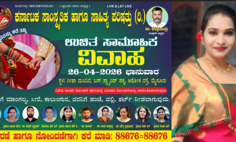 ಕುಶಾಲನಗರ, ಮಾ 31: ಕರ್ನಾಟಕ ಸಾಂಸ್ಕೃತಿಕ ಹಾಗೂ ಸಾಹಿತ್ಯ ಪರಿಷತ್ತು ವತಿಯಿಂದ ಏಪ್ರಿಲ್ 26 ರಂದು ಭಾನುವಾರ ಮೈಸೂರಿನಲ್ಲಿ ಉಚಿತ ಸಾಮೂಹಿಕ ವಿವಾಹ ಕಾರ್ಯಕ್ರಮ ಹಮ್ಮಿಕೊಳ್ಳಲಾಗಿದೆ ಎಂದು ಪರಿಷತ್ತಿನ ಕೊಡಗು ಜಿಲ್ಲಾಧ್ಯಕ್ಷೆ ಡಾ.ನಯನ ಹರಿಶ್ಚಂದ್ರ ಅವರು ತಿಳಿಸಿದ್ದಾರೆ.