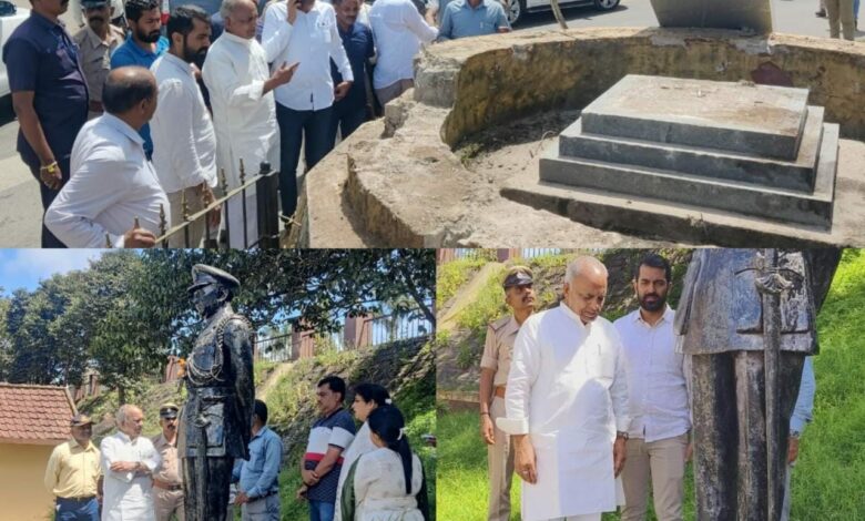 ಮಡಿಕೇರಿ, ಆ 28 ವೀರ ಸೇನಾನಿ ಜನರಲ್ ತಿಮ್ಮಯ್ಯ ಸ್ಮಾರಕ ಭವನದ ಆವರಣಕ್ಕೆ ಸ್ಥಳಾಂತರಿಸಲಾಗಿರುವ ಜನರಲ್ ತಿಮ್ಮಯ್ಯ ಅವರ ಪ್ರತಿಮೆಯನ್ನು ಕೊಡಗು ಜಿಲ್ಲಾ ಉಸ್ತುವಾರಿ ಸಚಿವ ಎನ್.ಎಸ್.ಭೋಸರಾಜು ಅವರು ಪರಿಶೀಲಿಸಿದರು. ಬಳಿಕ ಅಪಘಾತ ನಡೆದ ಪ್ರತಿಮೆ ಸ್ಥಾಪನೆಯಾಗಿದ್ದ ಜನರಲ್ ತಿಮ್ಮಯ್ಯ ವೃತ್ತಕ್ಕೆ ಭೇಟಿ ನೀಡಿ ವೀಕ್ಷಿಸಿದರು. ಶಾಸಕ ಡಾ.ಮಂತರ್ ಗೌಡ ಸಚಿವರಿಗೆ ಅಗತ್ಯ ಮಾಹಿತಿ ಒದಗಿಸಿದರು. ಹಾಲಿ ಇರುವ ಪ್ರತಿಮೆಯನ್ನೇ ಅಗತ್ಯ ದುರಸ್ಥಿ ನಡೆಸಿ ಪ್ರತಿಷ್ಠಾಪಿಸಲು ಸಚಿವರು ತಿಳಿಸಿದರು.
