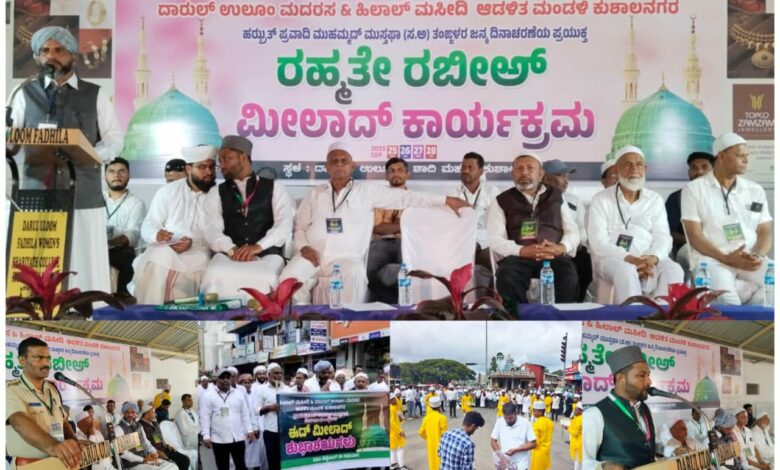 ಕುಶಾಲನಗರ ಸೆ 28: ಕುಶಾಲನಗರದ ದಾರುಲ್ ಉಲುಂ ಮದ್ರಸ ಹಾಗೂ ಹಿಲಾಲ್ ಮಸೀದಿ ಆಡಳಿತ ಮಂಡಳಿ ಸಂಯುಕ್ತಾಶ್ರಯದಲ್ಲಿ ಪ್ರವಾದಿ ಮುಹಮ್ಮದ್ ಪೈಗಂಬರ್ ಅವರ ಜನ್ಮ ದಿನದ ಪ್ರಯುಕ್ತ ಈದ್ ಮಿಲಾದ್” ಕಾರ್ಯಕ್ರಮವು ಕುಶಾಲನಗರದ ಶಾಧಿ ಮಹಲ್ ನಲ್ಲಿ ನಡೆಯಿತು.