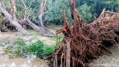 ಭಾರೀ ಮಳೆಗೆ ನದಿಗೆ ಅಡ್ಡಲಾಗಿ ಉರುಳಿ ಬಿದ್ದ ಮರ