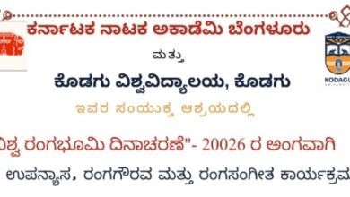 ಕುಶಾಲನಗರ, ಮಾ 25: ಕರ್ನಾಟಕ ನಾಟಕ ಅಕಾಡೆಮಿ ಬೆಂಗಳೂರು ಹಾಗೂ ಕೊಡಗು ವಿವಿ ವತಿಯಿಂದ ವಿವಿಯ ಸಭಾಂಗಣದಲ್ಲಿ ವಿಶ್ವ ರಂಗಭೂಮಿ ದಿನಾಚರಣೆ ಅಂಗವಾಗಿ ಮಾ 27 ರಂದು…