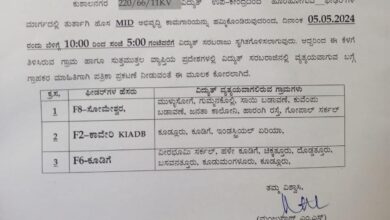 ಕುಶಾಲನಗರ, ಕೂಡಿಗೆ ವ್ಯಾಪ್ತಿಯಲ್ಲಿ ಮೇ, 05 ರಂದು ವಿದ್ಯುತ್ ವ್ಯತ್ಯಯ