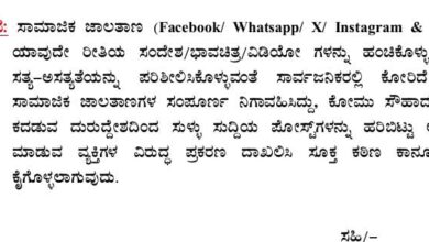 ಕುಶಾಲನಗರ, ಮೇ 07: Facebook/ Whatsapp/ Instagram & etc) ಸಮುದಾಯ/ ಜಾತಿ/ ಧರ್ಮ/ ವ್ಯಕ್ತಿಗಳ ವಿರುದ್ಧ ಉದ್ದೇಶಪೂರ್ವಕವಾಗಿ ಸುಳ್ಳು ಸುದ್ದಿಗಳನ್ನು ಹರಿಬಿಡುವುದು ಹಾಗೂ ತಮಾಷೆಗಾಗಿ (Prank)…