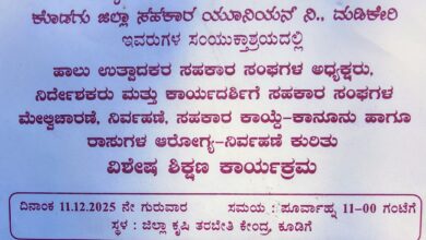 ಕೂಡಿಗೆ, ಡಿ. 9: ಕರ್ನಾಟಕ ಸಹಕಾರ ಮಹಾಮಂಡಳ ನಿ.ಬೆಂಗಳೂರು, ಕೊಡಗು ಜಿಲ್ಲಾ ಸಹಕಾರ ಯುನಿಯನ್ ನಿ.ಮಡಿಕೇರಿ ಇವರ ಸಂಯುಕ್ತಾಶ್ರಯದಲ್ಲಿ ಡಿ. 11 ರಂದು ಹಾಲು ಉತ್ಪಾದಕರ ಸಹಕಾರ…